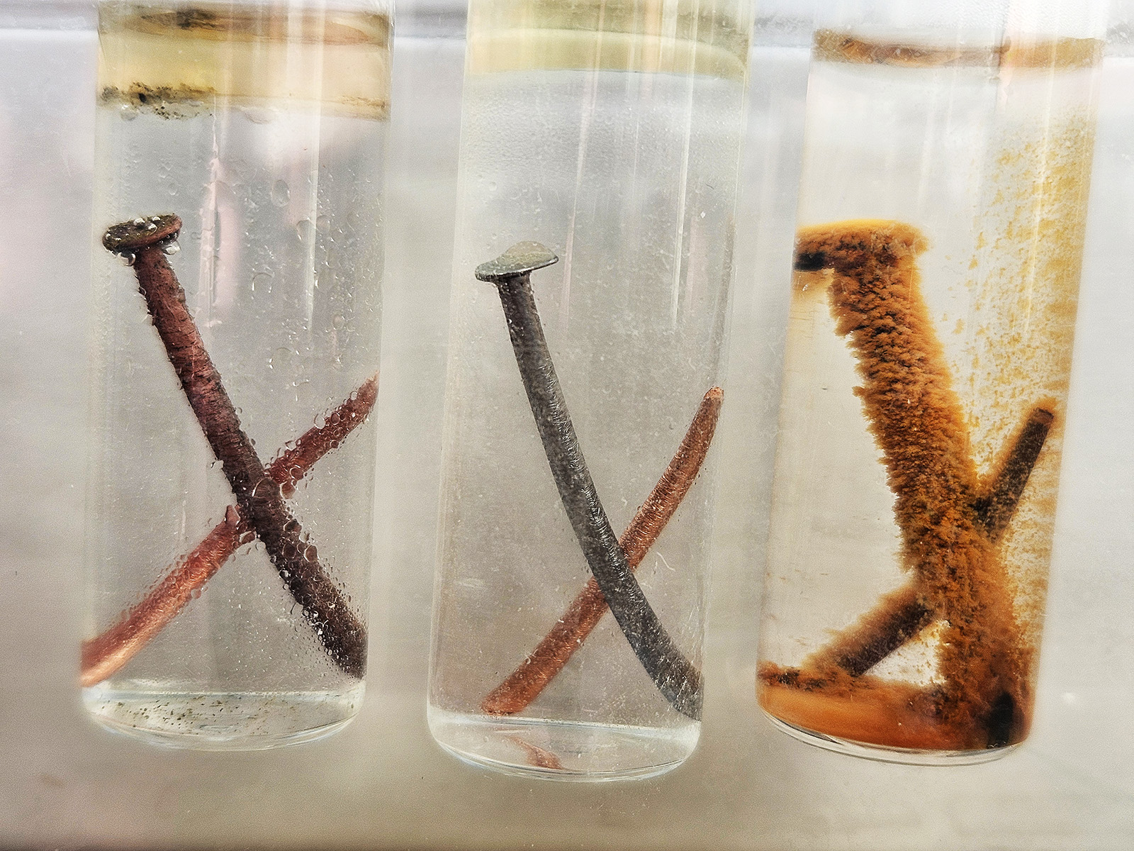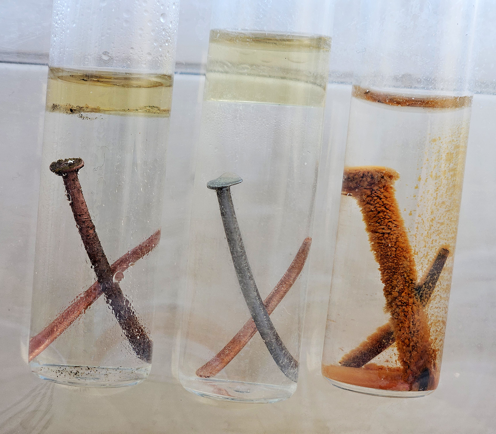 w procesie wietrzenia meteorytów). Przed testem gwoździe i druty odtłuściłem w acetonie i przeszlifowałem