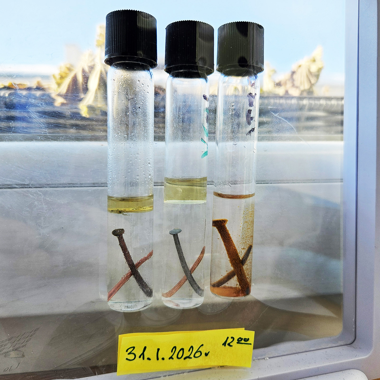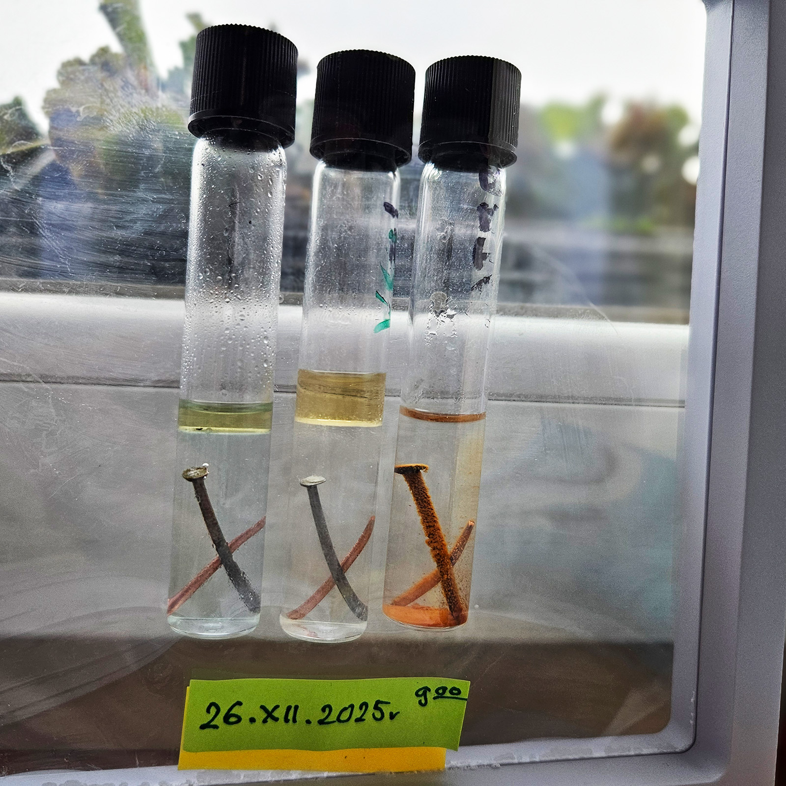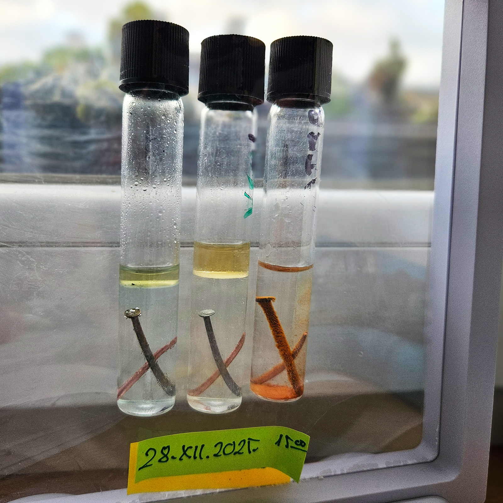 małe probówki z roztworami: Eksperyment wystartował 21 grudnia 2025 roku. Już następnego dnia, 22 grudnia, na gwoździu pojawiła się rdza! W pozostałych probówkach z preparatem VpCI-239 nie widać, jak na razie, żadnych oznak korozji!