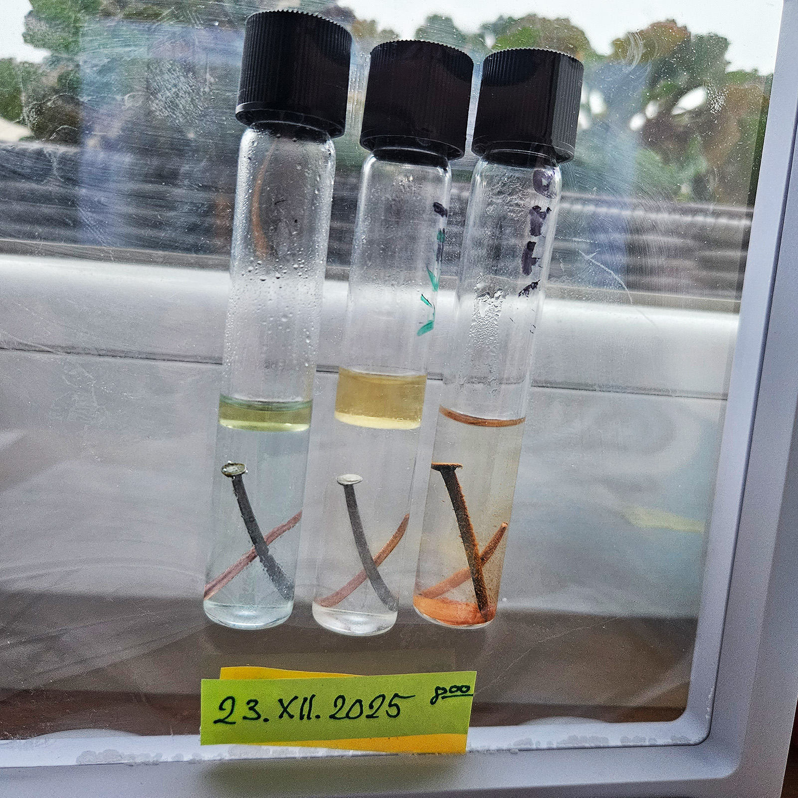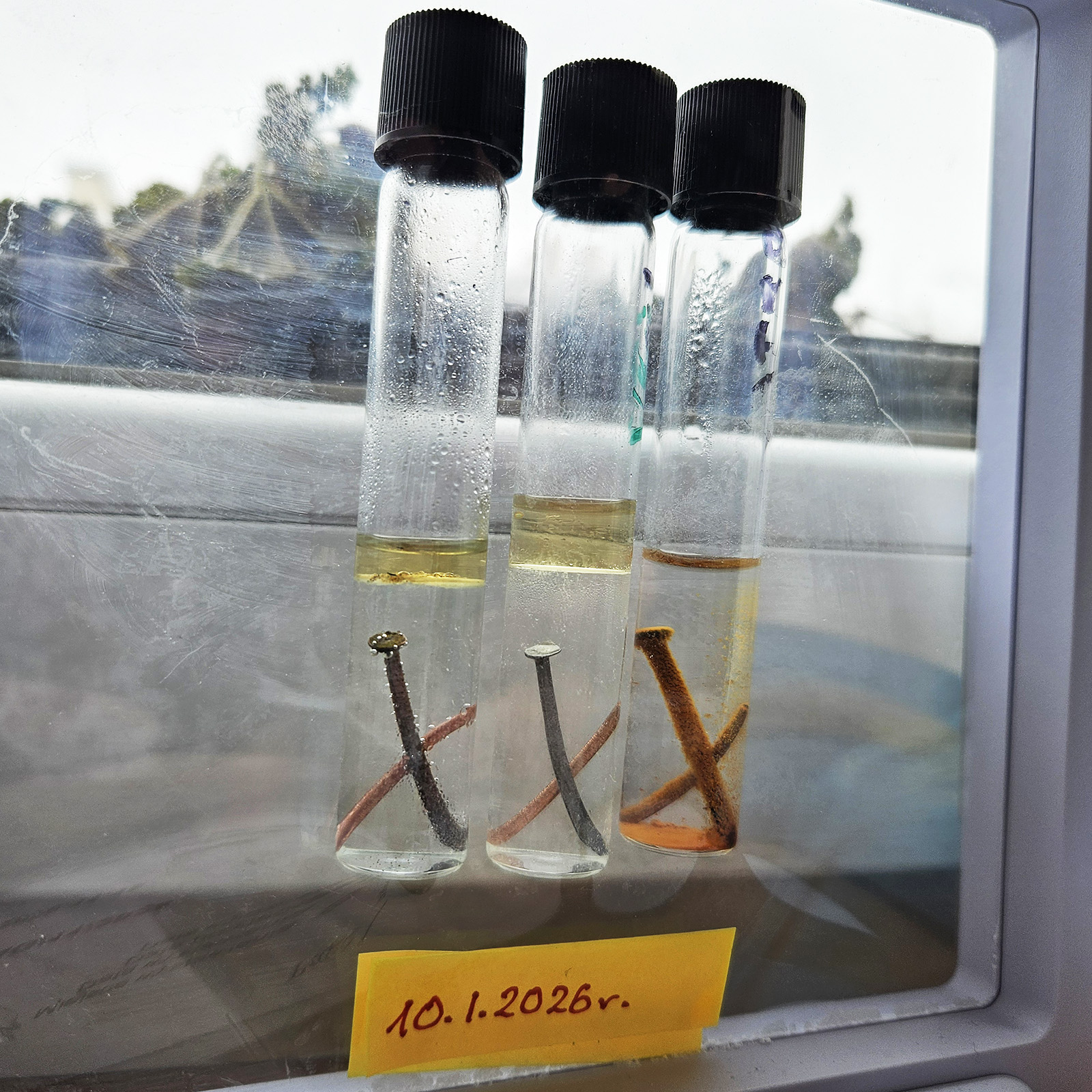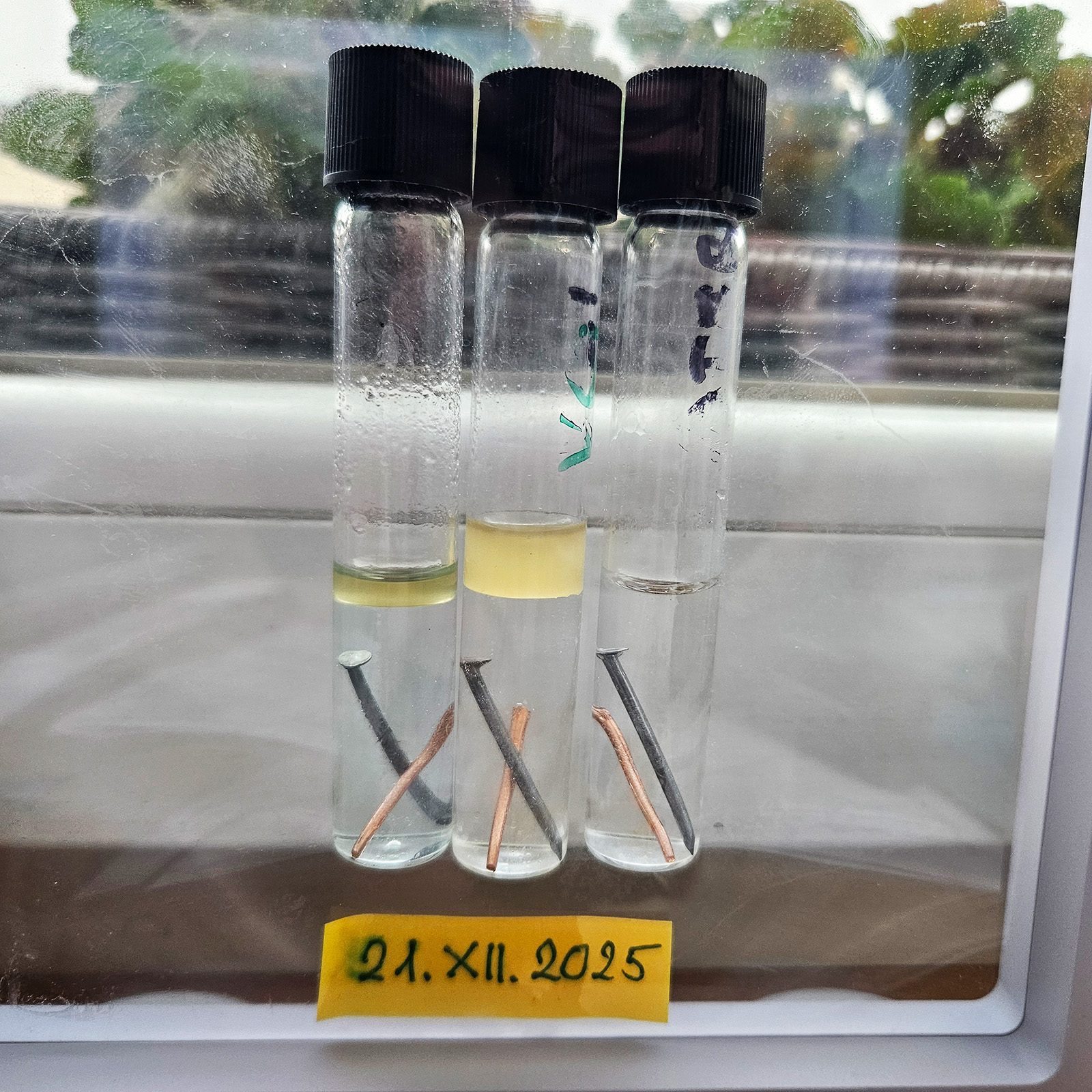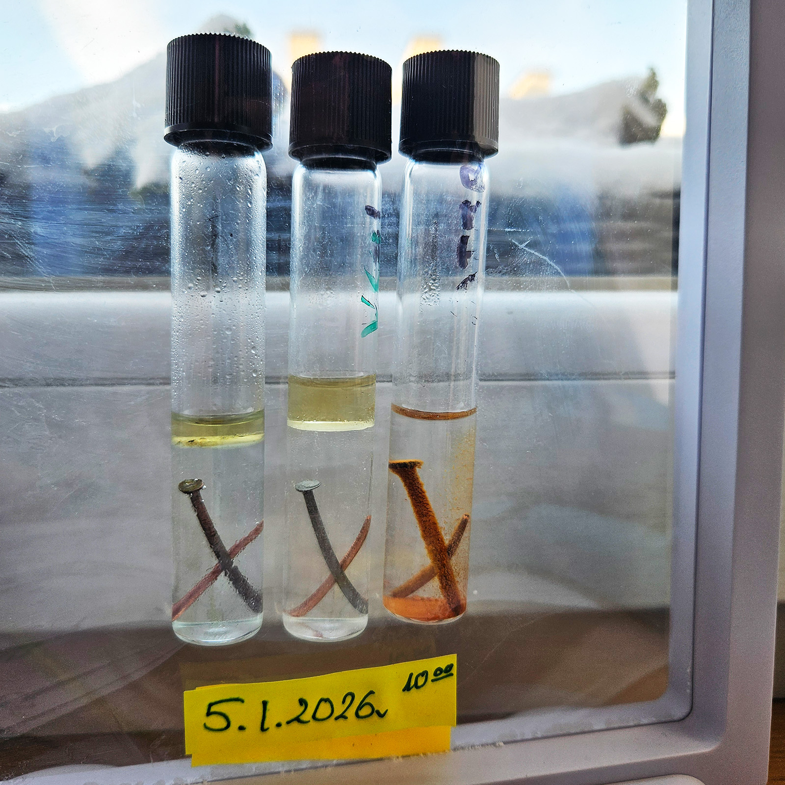 małe probówki z roztworami: Eksperyment wystartował 21 grudnia 2025 roku. Już następnego dnia, 22 grudnia, na gwoździu pojawiła się rdza! W pozostałych probówkach z preparatem VpCI-239 nie widać, jak na razie, żadnych oznak korozji!