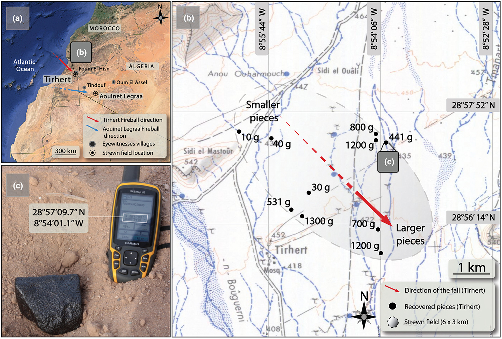 © Pierre-Marie Pelé – ilustracja za zgodą; Spadek w Tunezji 8 stycznia 2001 roku. Chondryt zwyczajny L6. Całkowita waga znalezionych okazów (TKW) 19 kg (poszukiwacze Fabien Kuntz, Marie Gerbet i Pierre-Marie Pelé w 2012 roku pojechali w rejon spadku i przeszukali go systematycznie. Efektem ich wyprawy było kilkadziesiąt (ponad 100 okazów, zebrano jeszcze ponad 12,5 kg) pięknych okazów, przygoda i materiał na książkę). Opis rysunku: Zespół Kuntz-Gerbet-Pelé systematycznie przeszukał rejon spadku i sporządził mapę rozkładu znalezionych okazów. Na załączonej mapie punkty oznaczają wagę okazów wg klucza: zielony – <20 g, pomarańczowy – 20-50 g, granatowy – 50-100 g, czarny – 100-200 g, czerwony – 200-1000 g i największy (jeden) ponad 1 kg. Północ na górze, bok załączonego wycinka mapy ma około 5 km. Więcej szczegółów w książce. Źródła: Pelé Pierre-Marie, Kuntz Fabien, Gerbet Marie, (2013), Beni M’hira, la météorite oubliée (ang. Beni M’hira, the forgotten meteorite). (fr.) 2013; [cover]. Mapa otrzymana od Pierre-Marie Pelé i zamieszczona za jego zgodą. Okaz Beni M'hira* w kolekcji. |